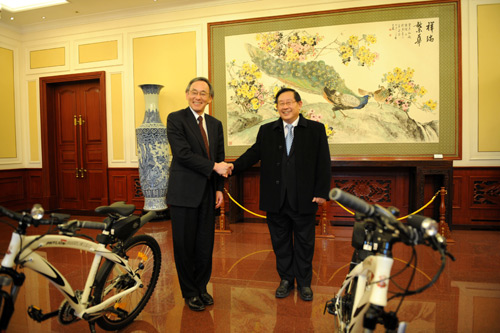 图:09年13月,曾任信息技术部上长万钢向芬兰生物质能源部上长朱棣文转交赠予奥巴马的HAHA体育 锂电车